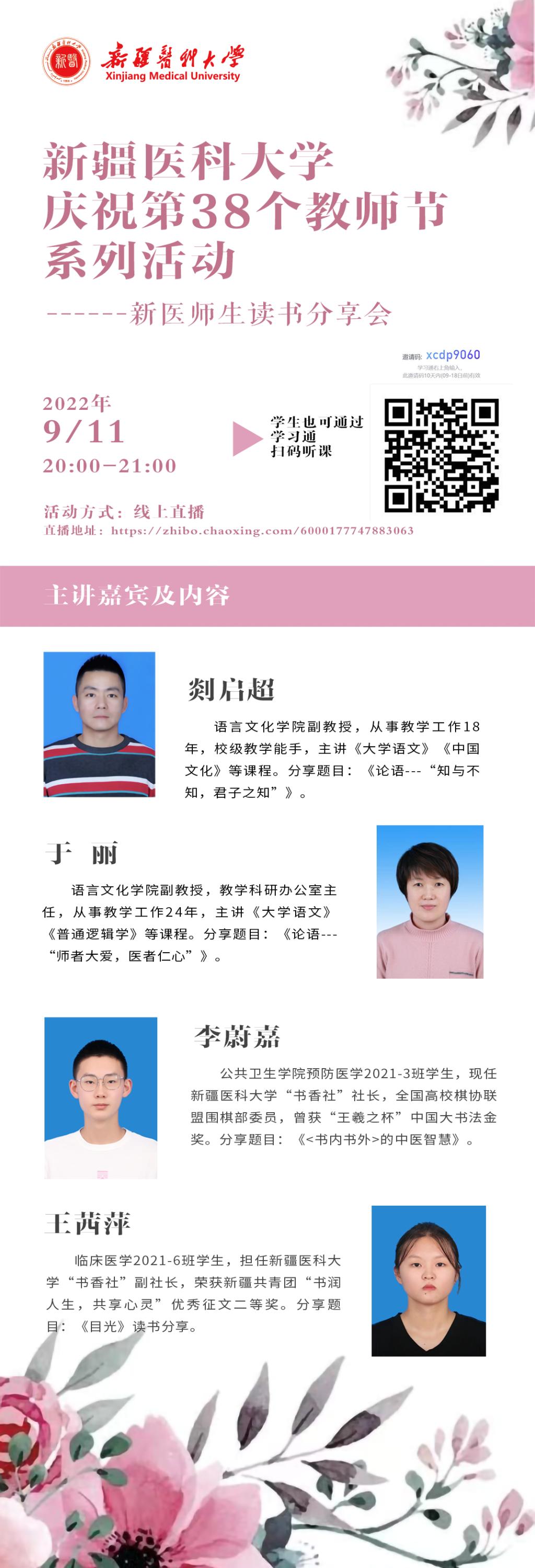 9月11日,beat365中文在线官网庆祝第38个教师节系列活动——新医师生读书分享会在线上顺利举行,活动由教务处主办,图书馆、校团委、学生处协办。