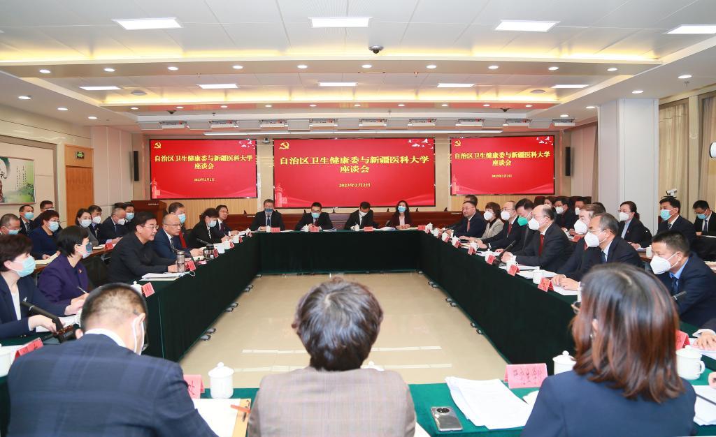 自治区卫健委领导何永慧、于爱平等全体在家委领导,相关处室和相关直属单位负责人,beat365中文在线官网领导李国良、阿吉艾克拜尔·艾萨等校党委班子全体成员,相关部门及八所附属医院主要负责人参加了座谈会。