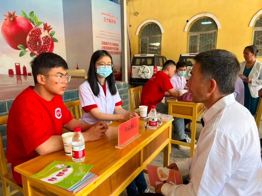 在和田地区墨玉县,实践队员们通过现场义诊和上门走访的方式,为当地村民进行健康检测及医药知识普及。义诊现场,队员们为前来领药的村民们测血压、测血糖,开展一系列健康体检服务,详细讲解药效和注意事项,一边演示急救方法一边讲解操作步骤、手法要点等规范要领,引导村民们更全面、深入了解健康知识,他们还向村民们介绍常见疾病的预防和治疗方法,讲解良好的生活习惯和健康饮食的重要性。