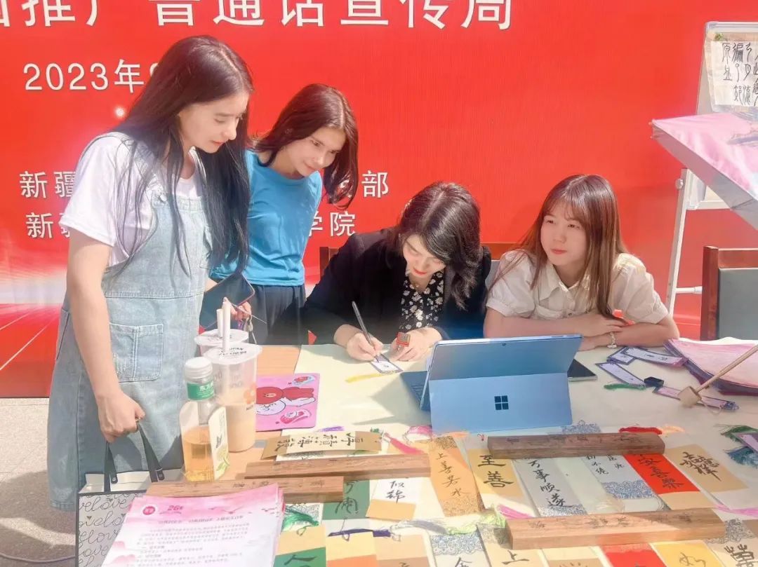 在第26届普通话推广周期间,beat365人文学院在雪莲山校区芳林广场陈设推普周宣传文化墙,开展书法作品展示、艺术书签撰写等文化体验活动,发放国家通用语言文字宣传手册等,积极宣传国家通用语言文字。