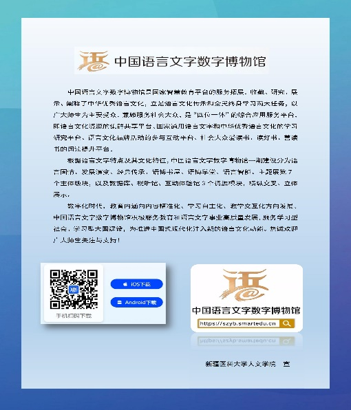 学校积极利用数字化资源,向全校师生推荐线上“中国语言文字数字博物馆”APP,汇编《国家通用语言文字政策法规与语言规范宣传手册》,使师生进一步了解国家通用语言文字政策法规与语言规范。