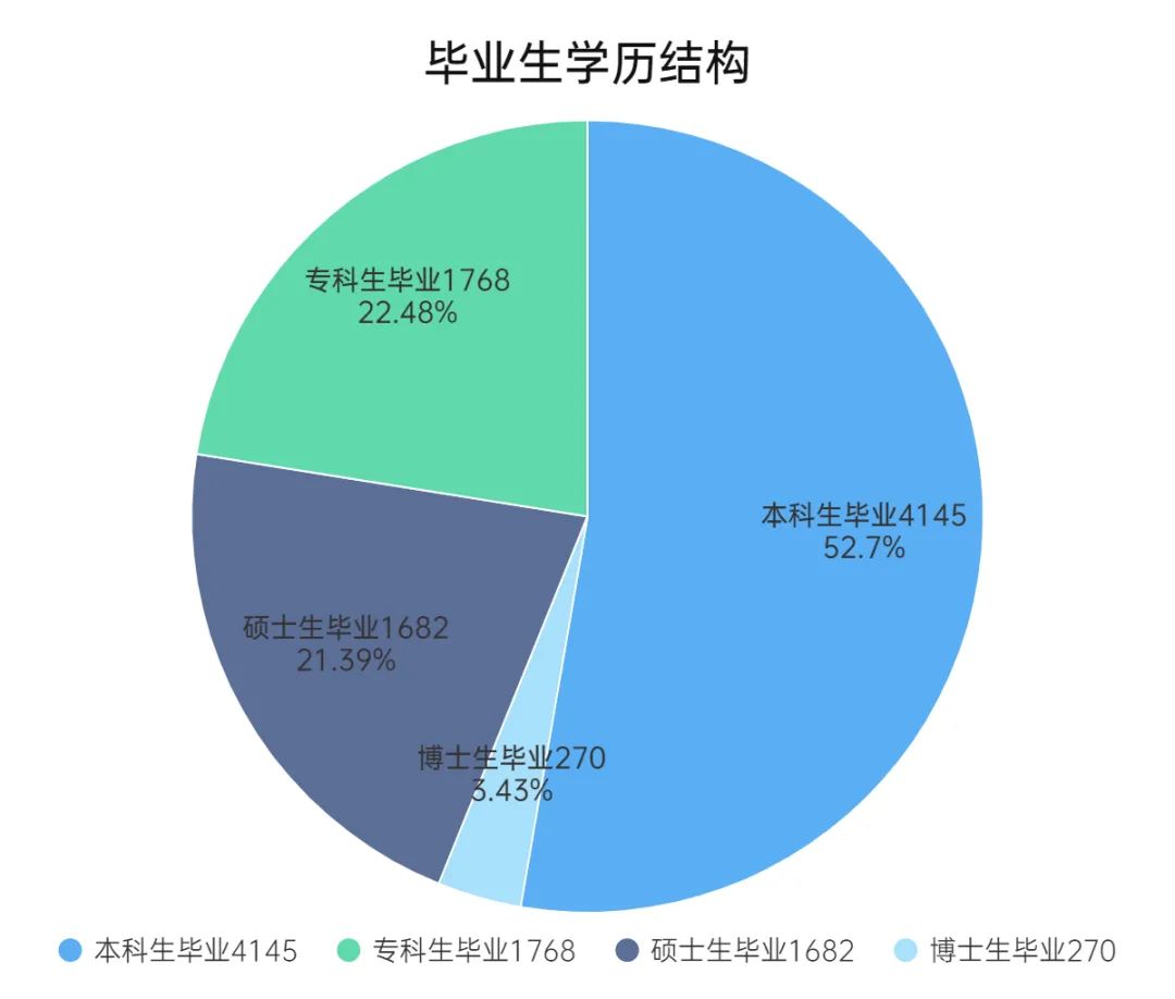 2024届毕业生总计7865人。专科1786人,占比22.48%;本科4145人,占比52.70%;研究生(硕博)1952人,占比24.81%。2024届毕业生为学校历年来人数及专业最多的一年,创历史新高。