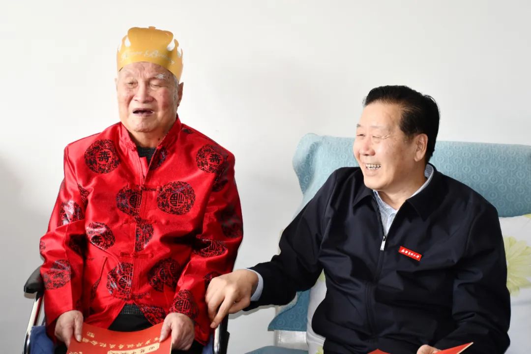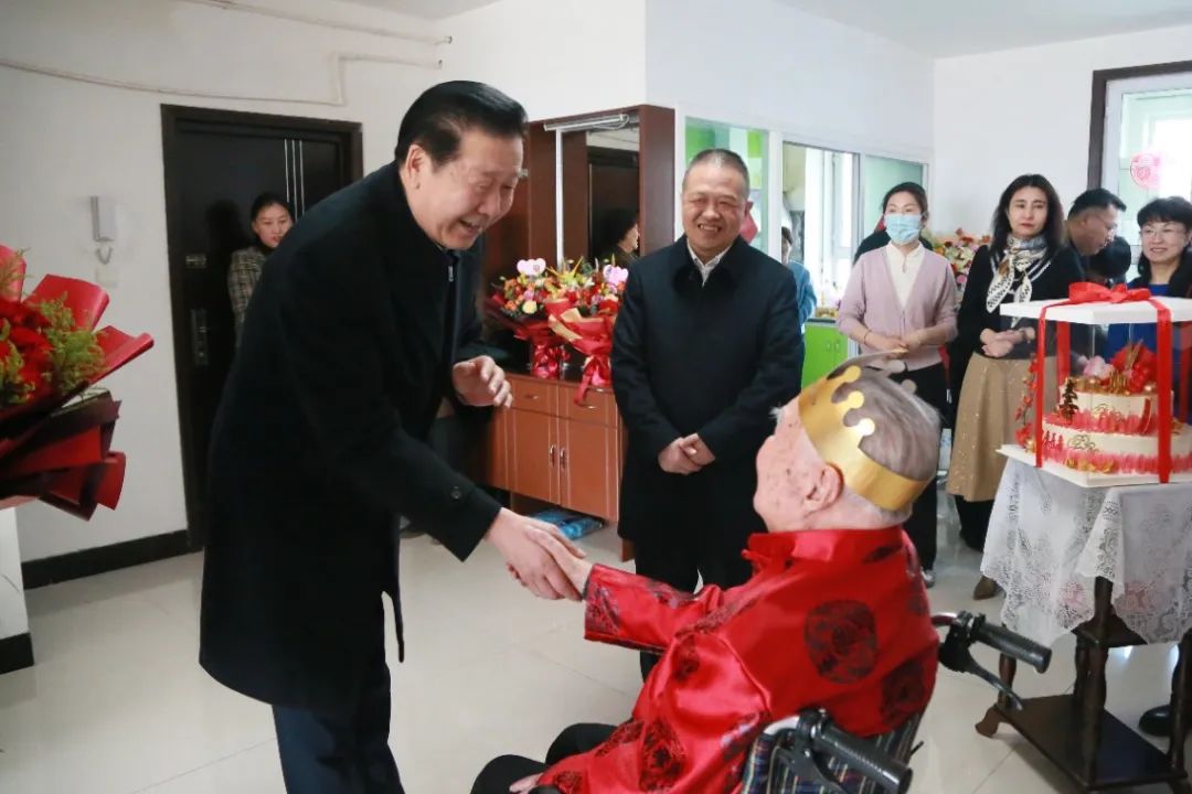 赵天杰紧紧握住田老的手,同他亲切交谈并致以诚挚问候,“田教授,我们代表学校专程过来看望您,祝您生日快乐,健康长寿!您过去所做的贡献,医院忘不了,大学也忘不了!您的健康长寿是我们大家的最大心愿!”田老激动地频频点头表示感谢。