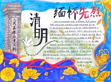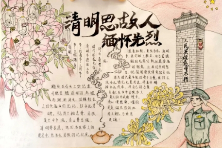 中医学院“丝路岐黄”一站式学生社区“石榴籽”党员服务站,举办了“清明忆先烈,传承民族魂”清明节手抄报及缅怀革命先烈送寄语活动。同学们积极参与,认真绘画,一份份手抄报展示在我们的面前,他们用自己手中的画笔记录下英雄的故事,在一笔一画中祭奠英烈,抒发自己的爱国之情和报国之志。
