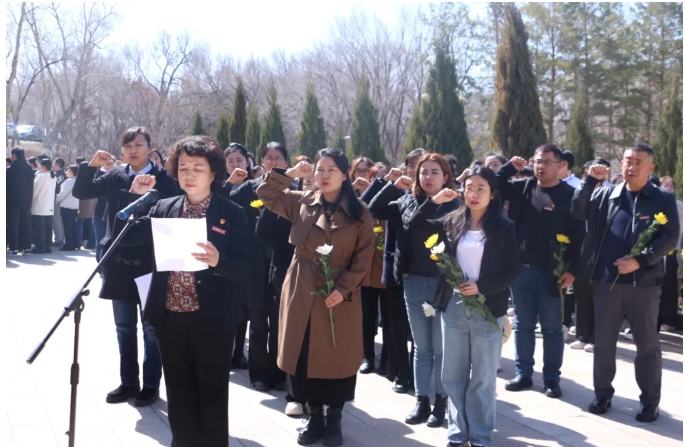 在庄严的革命烈士纪念碑前,全体人员神情凝重,整齐列队,向烈士默哀,重温入党誓词,向烈士墓碑鞠躬献花,向英雄们致以最崇高的敬意与最真挚的爱戴。
