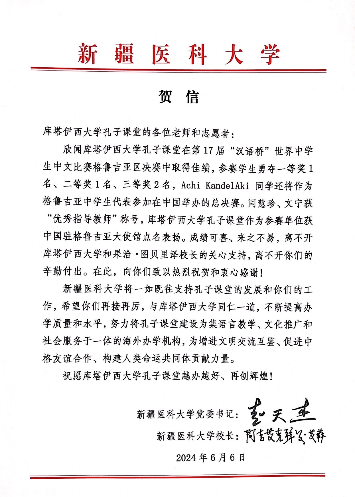 赵天杰、阿吉艾克拜尔·艾萨向库塔伊西大学孔子课堂致贺信