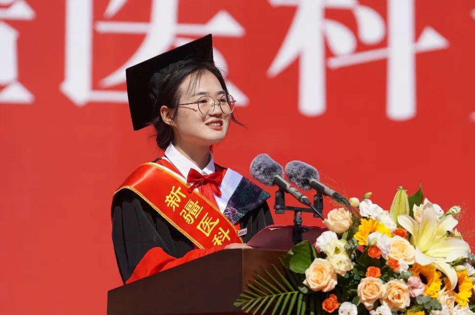 本科毕业生代表、第二临床医学院杨健辉同学,硕士毕业生代表、公共卫生学院的吐尔逊阿依•达吾提同学,博士毕业生代表、第一临床医学院的张小雪同学和留学生代表、国际教育学院的阿沙德·阿斯兰同学上台发言,深情表达了对母校辛勤培育的感谢与感恩,回顾了在校期间求知若渴、好学不倦的奋斗足迹,展现了勤于实践、锐意进取的坚强品质,和师生们朝夕相处、团结友爱的深厚情谊。毕业生们表示,无论身在何处,新医是我们永远的家,我们将带着所学本领扬帆启航,与母校一起并肩奋进,争做有向上理想,向善灵魂、向勤品格、向阳姿态、向美追求的新医学子,为人类健康福祉贡献力量,奋力书写为中国式现代化挺膺担当的青春篇章!