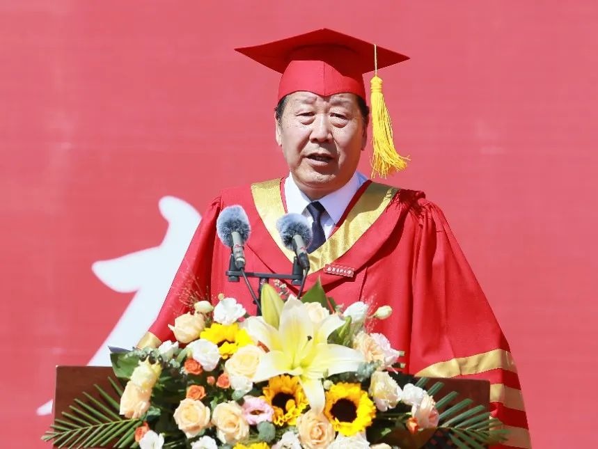 赵天杰代表学校党委、全体教职工,向全体新医毕业生们表示衷心祝贺,向精心培育新医学子成长成才的家长和老师们表示崇高的敬意!他对2024届毕业生们说,几年前,你们怀着“孩儿立志出乡关,学不成名誓不还”的理想,跨越山河相聚新医。你们与时代同频,经历了新中国成立70周年、中国共产党成立100周年、党的二十大胜利召开等大事喜事,也经历了新校区搬迁、疫情防控等要事难事,你们与新医共进,在新医的光辉历程中赓续传承。你们与青春共舞,在努力拼搏的汗水中完成华丽蜕变,你们“青春向党、不负韶华”,传承“好学、力行、笃医、创新”的校训精神,以蓬勃朝气和昂扬姿态不断为学校注入新的活力!