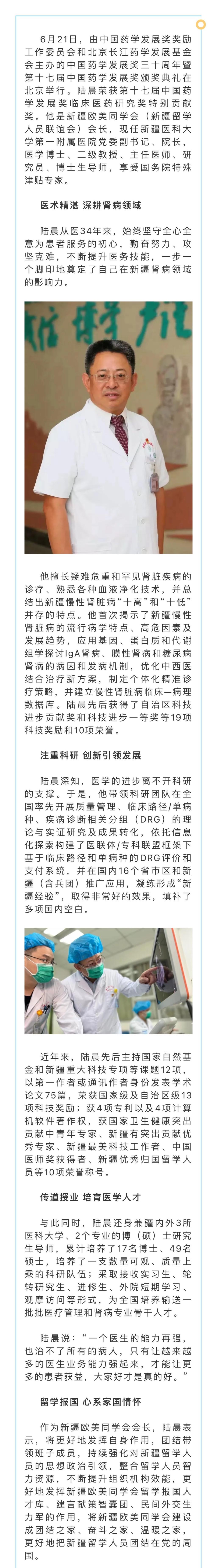 “我愿天地炉,多衔扁鹊身。”陆晨数十年如一日,对病人热忱服务,对科研精益求精,用自己的行动践行了一名医者救死扶伤的铮铮誓言,诠释了“敬佑生命、救死扶伤、甘于奉献、大爱无疆”的职业精神。