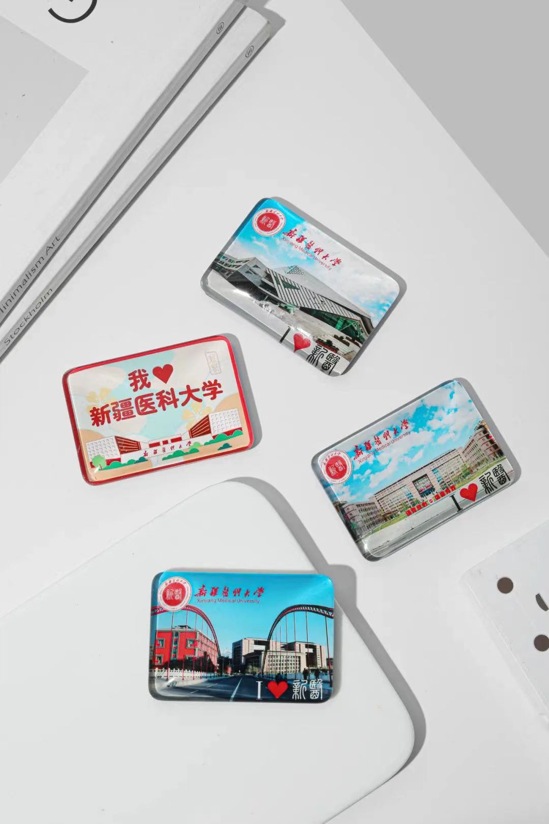 以校园建筑和校徽为原型