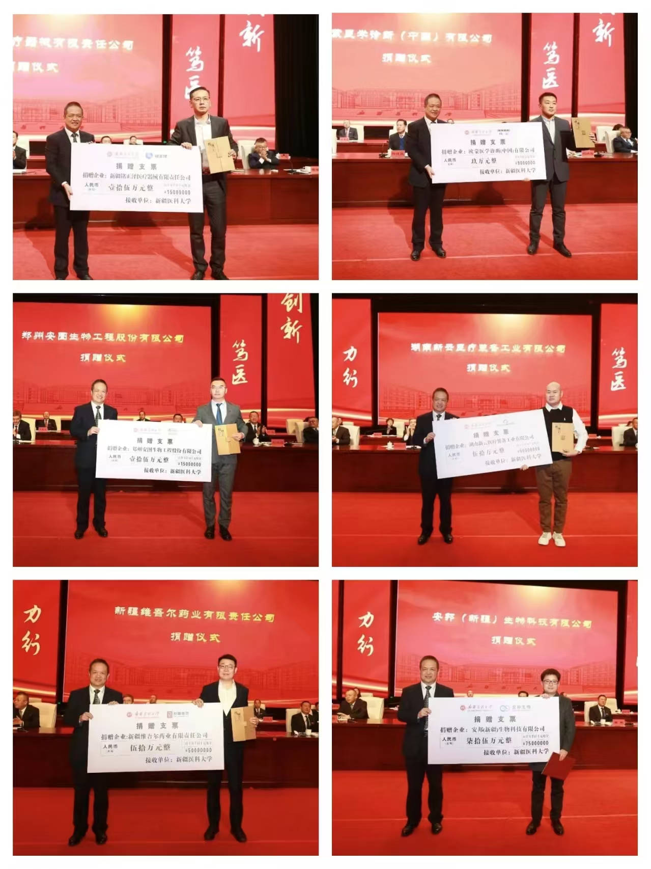 会议举行了启动助力学生成长成才爱心捐赠仪式,新疆维吾尔药业有限责任公司、安邦(新疆)生物科技有限公司、湖南新云医疗装备工业有限公司、郑州安图生物工程股份有限公司、欧蒙医学诊断(中国)有限公司、新疆铭正泽医疗器械有限责任公司,六家企业向beat365捐赠了助力学生成长成才爱心基金。