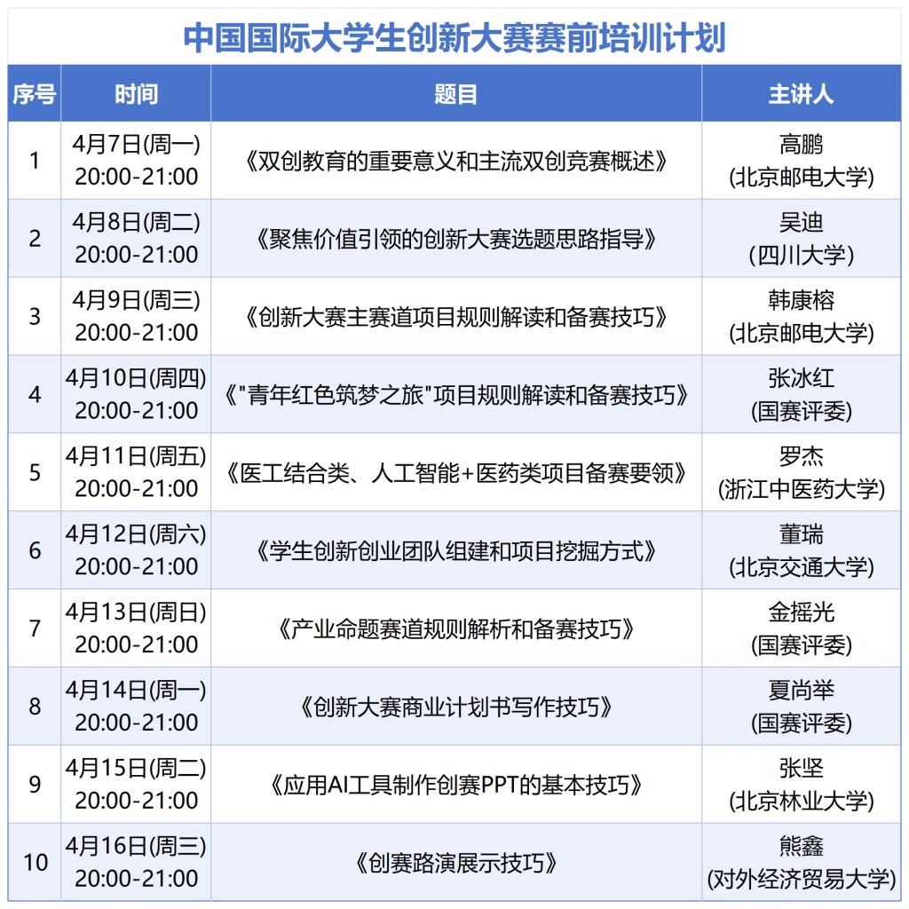 本次培训内容包含中国国际大学生创新大赛各赛道,具体安排如下: