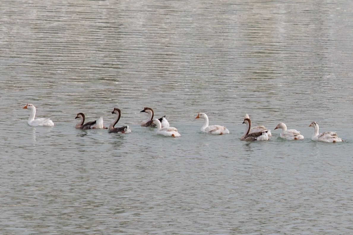 鸭子划开水面长椅上并排的三道影子