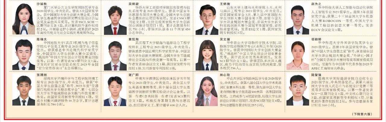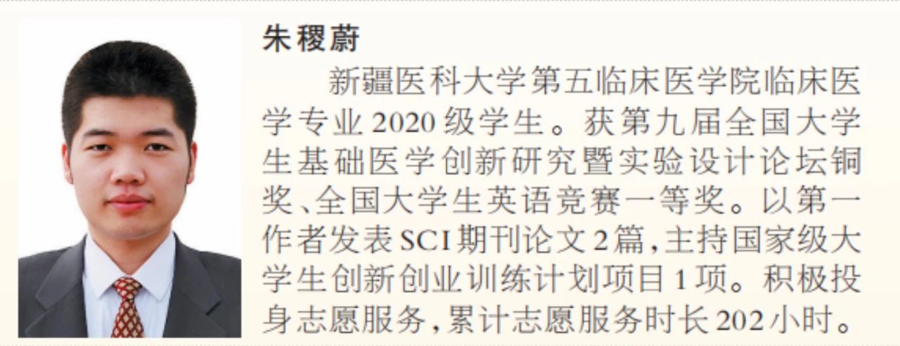 他专注学科前沿,围绕肠道菌群研究,以第一作者发表SCI2篇、中文核心期刊1篇,参与发表核心期刊2篇;主持国家级大学生创新创业项目1项优秀结题。积极投身志愿服务,累计服务时长202小时。参与“寻访红色地标·传播信仰之声”社会实践活动,完成报告数篇,获得校级社会实践“先进个人”荣誉称号。