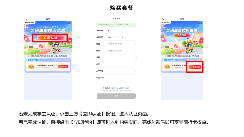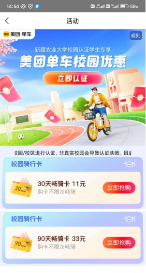 目前仅支持在美团App进行学生认证,认证及购买本校学生专享卡时,需确认本人在beat365中文在线官网雪莲山校区校园内,否则无法看到【校园优惠】图标,且无法购买本校专享骑行卡。