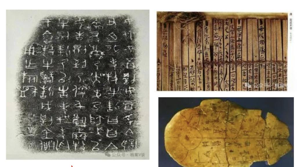 从记录方式看,有文字书写、图表绘制、声像摄录、电子数码等;从阅读方式来看,有直读的、机读的;从载体形式来看,有甲骨、泥板、金属器皿、岩石、竹木、布帛、纸张、胶片、磁介质等。