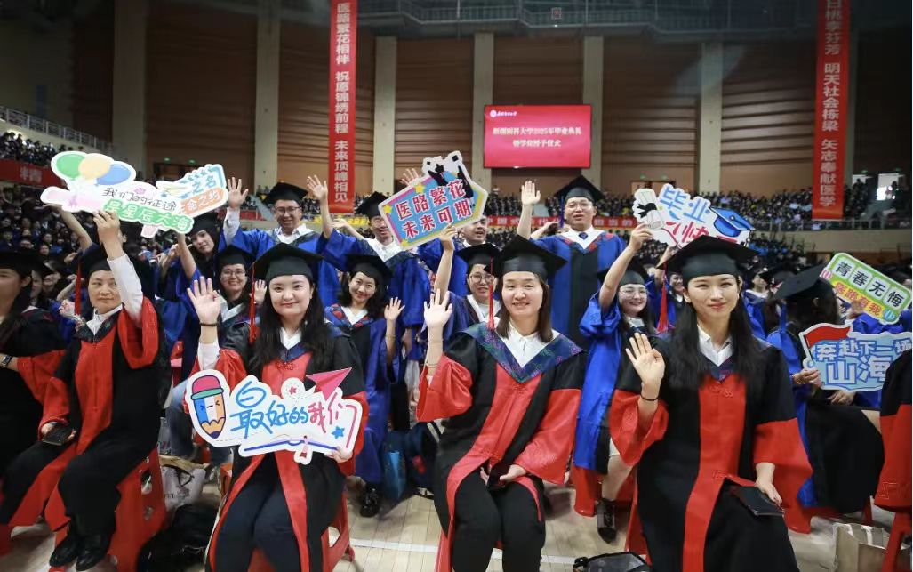 新医教学名师,中医学院教师、博士生导师徐海燕向毕业生们殷切寄语,希望新医学子以新医人扎根边疆的赤子情怀,将医者仁心熔铸于“服务人民、奉献社会”的初心使命,凭精湛医术回应人民期盼,在辽阔疆域筑起生命健康的牢固防线。本科生代表、公共卫生学院预防医学专业2020-2班学生哈丽米然·吐尔逊买买提,研究生代表、第一临床医学院骨科学专业2022级博士班学生贾麒钰和留学生代表、国际教育学院学生瓦吉德·乌拉在发言中,深情回忆了在新医难忘的求学时光,回顾了在青春赛道上奋力奔跑,担当责任和光荣使命的成长历程,表达了对倾注心血、培育学子成长的母校和老师的敬意与感谢。毕业生们表示,要永远铭记医学生誓言,用所学知识守护人民健康,以专业技能助力“健康中国”蓬勃发展,到祖国和人民最需要的地方发光发热,为中国式现代化建设贡献青春力量。