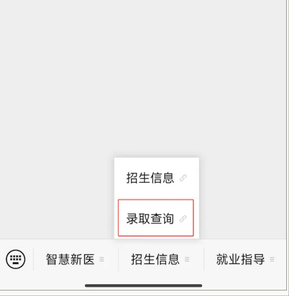 1、微信搜索关注“青春新医”官方微信公众号,进入公众号,选择底部菜单栏“招生信息”,点击“录取查询”。