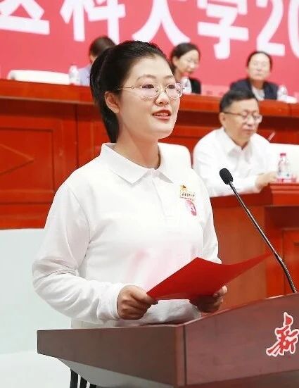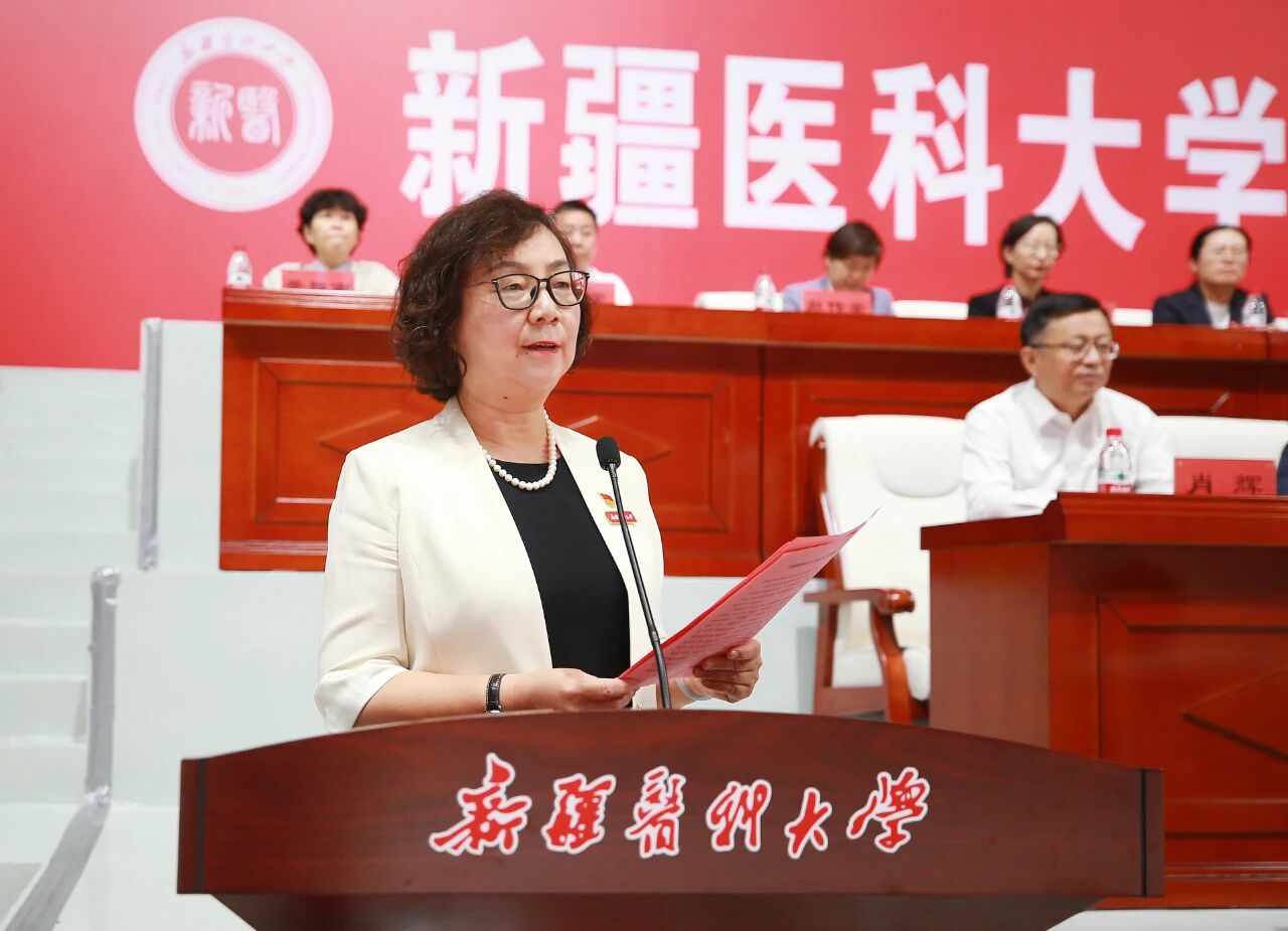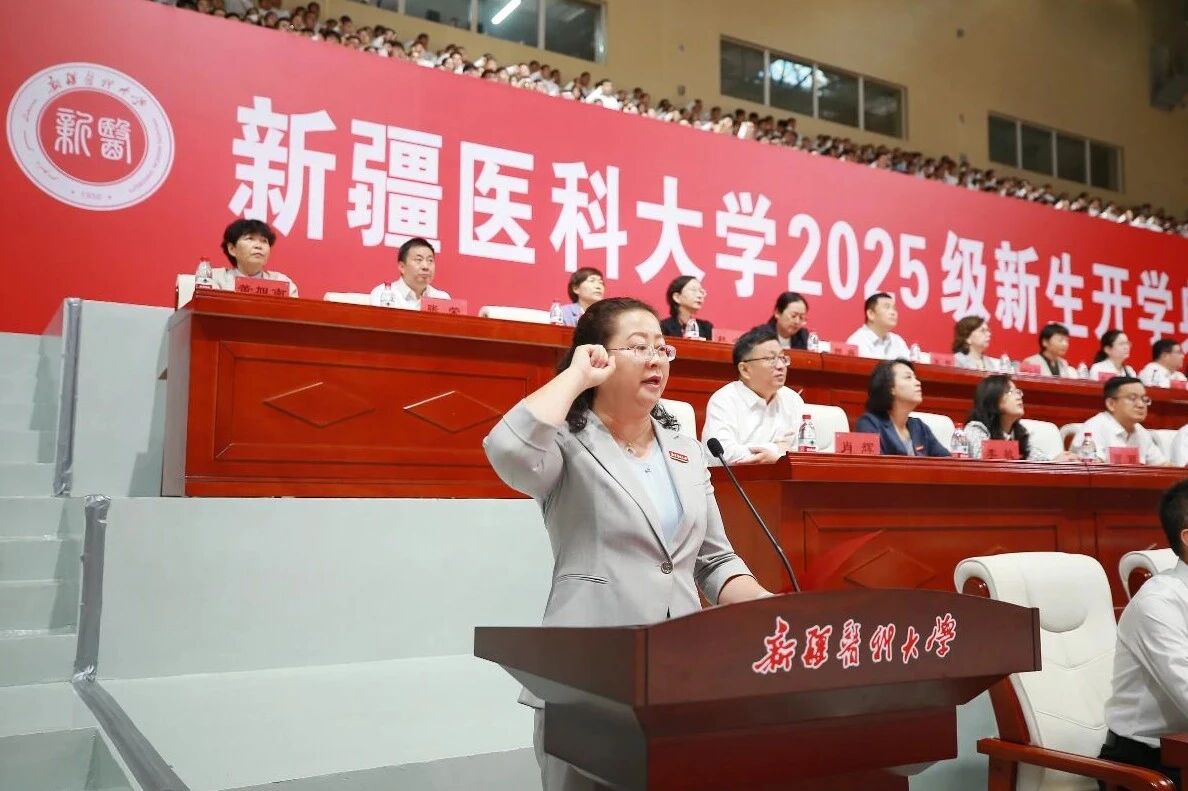 教师代表、国务院政府特殊津贴专家,药学院教授高晓黎在发言中深情回顾了自己与beat365中文在线官网共同成长的岁月,表达了对医药事业的热爱、对新疆土地的深情和一名共产党员科技报国的使命。她特别分享了其团队“孕马结合雌激素的新药研发与产业化”科研项目的艰辛与成就,并勉励全体新生要“做有温度的医者,先做有态度的学生。”希望同学们守护好学医的热情与初心,始终保持对生命的尊重与敬畏,在历练中沉淀、在挑战中坚守,在新医的广阔沃土上,立鸿鹄之志、练过硬本领,拓宽能力视野,实现人生梦想,成长为医术精湛、心怀仁爱的新医人。