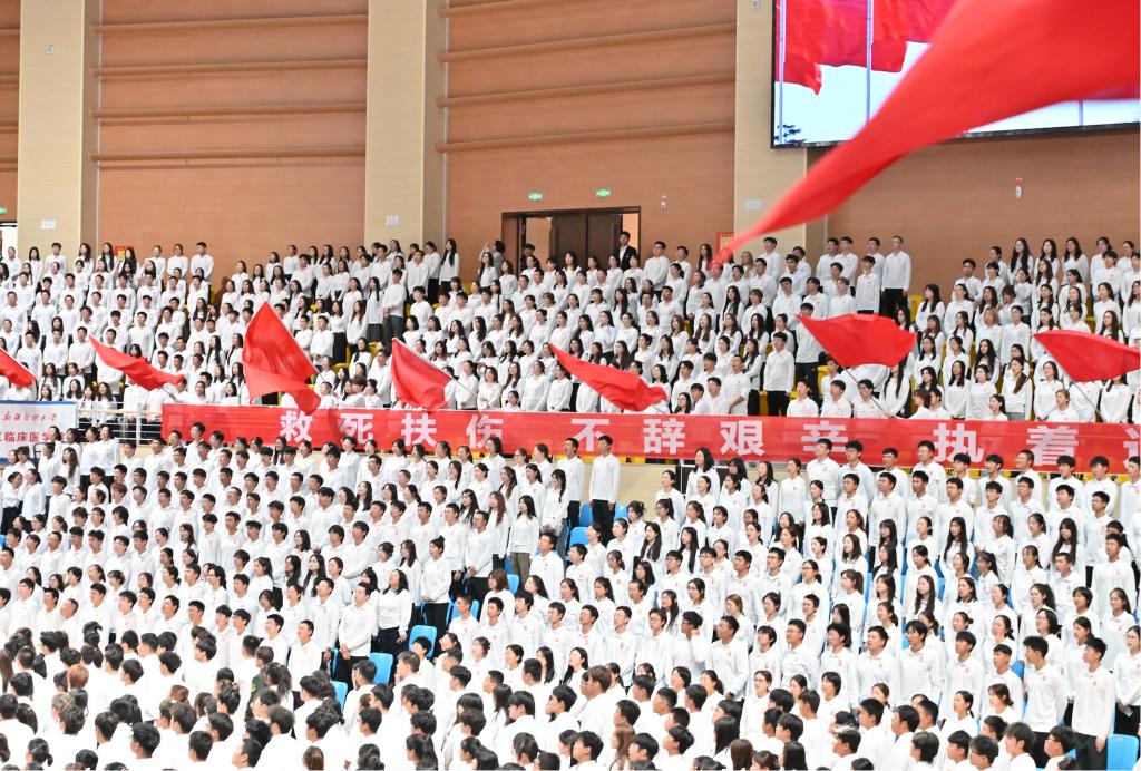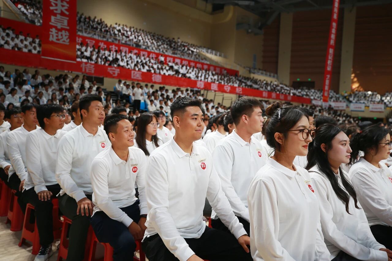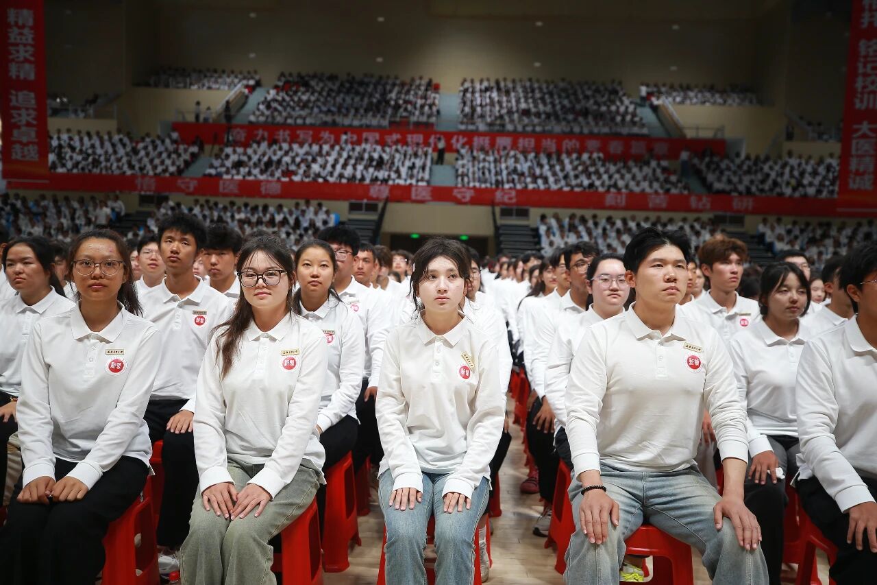 随后,在刘涛副校长的带领下,全体新生肃然起立,高举右拳,用洪亮而坚定的声音庄严宣誓《中国医学生誓言》——“我志愿献身医学,热爱祖国,忠于人民……”铿锵有力的誓言在体育馆内回荡,字字千钧、句句入心,彰显出新医人投身医学事业、守护人民健康的赤诚初心与无悔决心。这一刻,誓言与信念交织,理想与使命共鸣,为所有新生的医学之路烙下了崇高的精神印记。