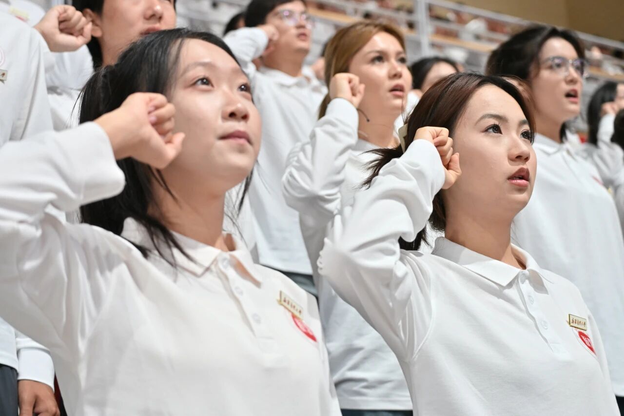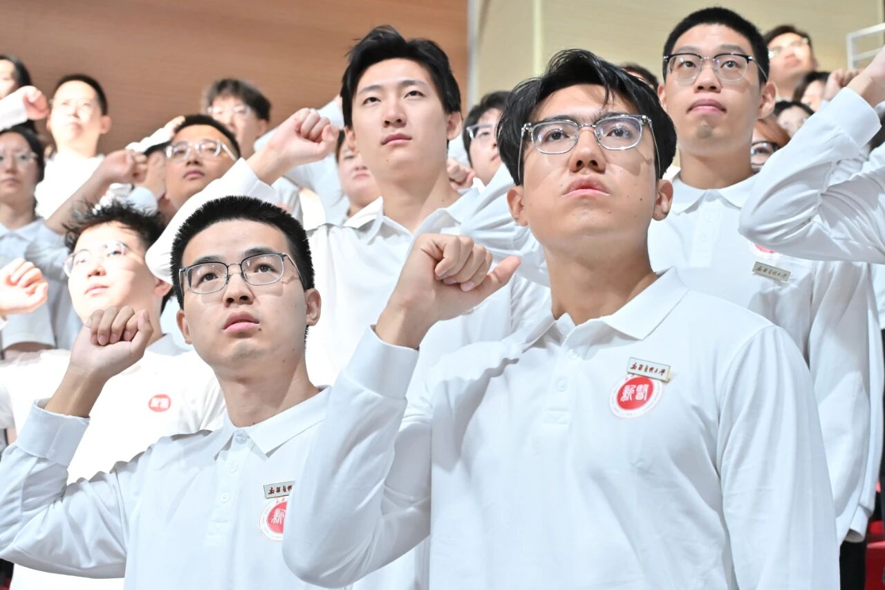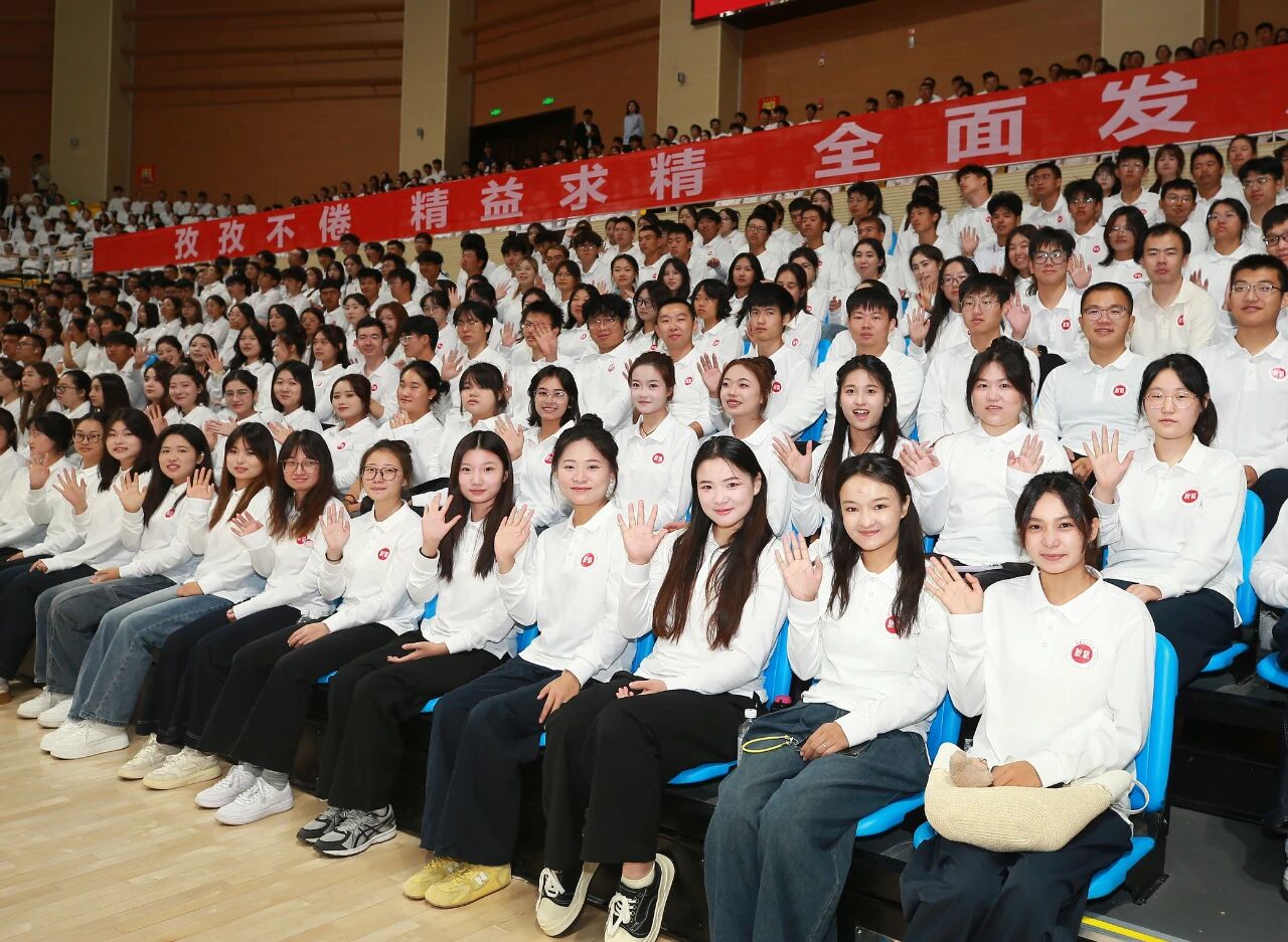 随后,在刘涛副校长的带领下,全体新生肃然起立,高举右拳,用洪亮而坚定的声音庄严宣誓《中国医学生誓言》——“我志愿献身医学,热爱祖国,忠于人民……”铿锵有力的誓言在体育馆内回荡,字字千钧、句句入心,彰显出新医人投身医学事业、守护人民健康的赤诚初心与无悔决心。这一刻,誓言与信念交织,理想与使命共鸣,为所有新生的医学之路烙下了崇高的精神印记。