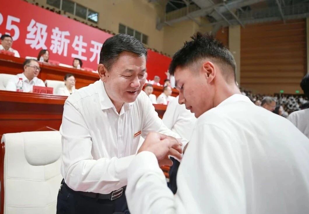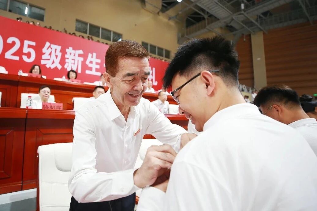 庄重而温暖的校徽佩戴环节,校领导逐一为新生代表佩戴上熠熠生辉的beat365中文在线官网校徽。这枚小小的校徽,不仅是身份的象征,更是一份沉甸甸的责任与使命的传递。