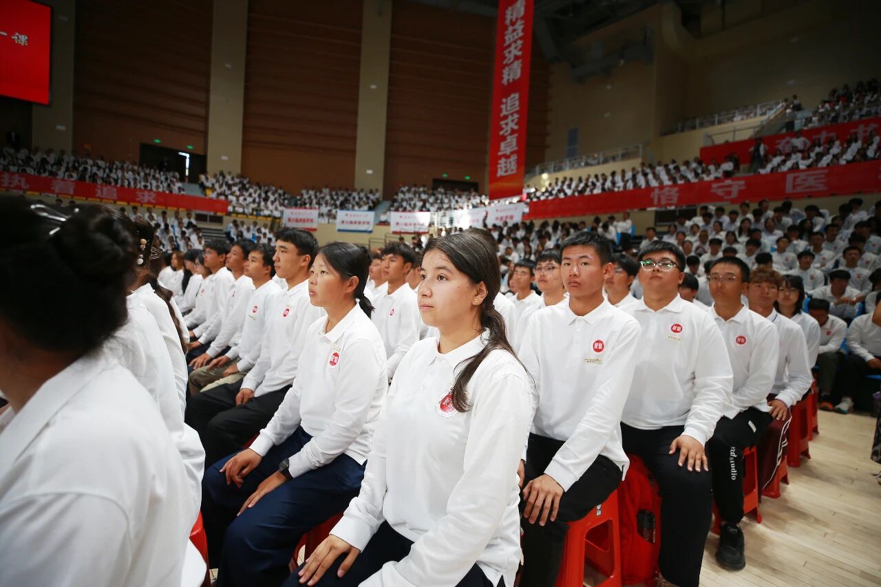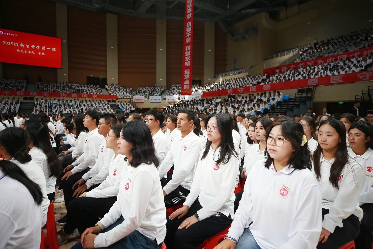 柴林勉励全体新生要深刻理解并自觉传承学校深厚的红色底蕴与新医精神,将个人理想融入健康中国、健康新疆的建设伟业,在新医这片沃土上书写无愧于时代、无愧于人民的青春华章。他围绕“德、智、体、美、劳”五大方面,对全体新生提出了殷切期望和成长指引。一是以德铸魂,筑牢精神之基。希望新医学子始终高扬爱国主义旗帜,自觉传承学校“扎根边疆、从医为民”的红色基因与崇高精神,不断铸牢中华民族共同体意识,主动参与各类融情实践与志愿服务,用实际行动厚植家国情怀、强化使命担当,努力成长为信仰坚定、堪当民族复兴重任的新时代医学人才。二是以勤精术,锻造过硬本领。我们要将勤奋作为从医之路的基石,主动构建贯通融合的知识体系,聚焦新疆特高发疾病防治、特色药用资源开发等区域健康问题,探索运用基因技术、智能医学、大数据分析等新工具、新方法,在解决真实问题中锤炼扎实本领,为将来应对各种挑战奠定坚实的能力基础。三是以体强身,练就强健体魄。要率先成为健康生活的践行者和示范者,将体育锻炼融入日常生活,让运动成为习惯,让健康成为常态。多给身体充电、多为社交扩容,永葆乐观之心、常怀豁达之态,为将来承担救死扶伤的重任积蓄充沛的身心能量,以昂扬的姿态迎接医学道路上的各种挑战。四要以美润心,涵养人文情怀。要始终保持对医学之美的热爱、对职业初心的敬畏,牢固树立生命至上、健康所系的价值理念,感知冷暖、体恤疾苦,以仁心仁术书写医者的尊严与担当,成长为有温度、有情怀、懂尊重、善关怀的新时代良医。五要以劳笃行,锤炼实干担当。要体会传承“好学、力行、笃医、创新”的校训,做好长期奋斗、不怕吃苦的思想准备,重视临床实习与实践教学,积极参与基层义诊、健康宣教等志愿服务,将理论所学淬炼为临床实战的真本领,在躬身实践中成长为人民信赖的健康守护者。愿同学们在未来数年的时光里,以执着的信念、坚定的脚步追光逐梦,在接续奋斗中不断擦亮beat365中文在线官网这块“金字招牌”,成长为推进国家富强、民族复兴的先锋力量!