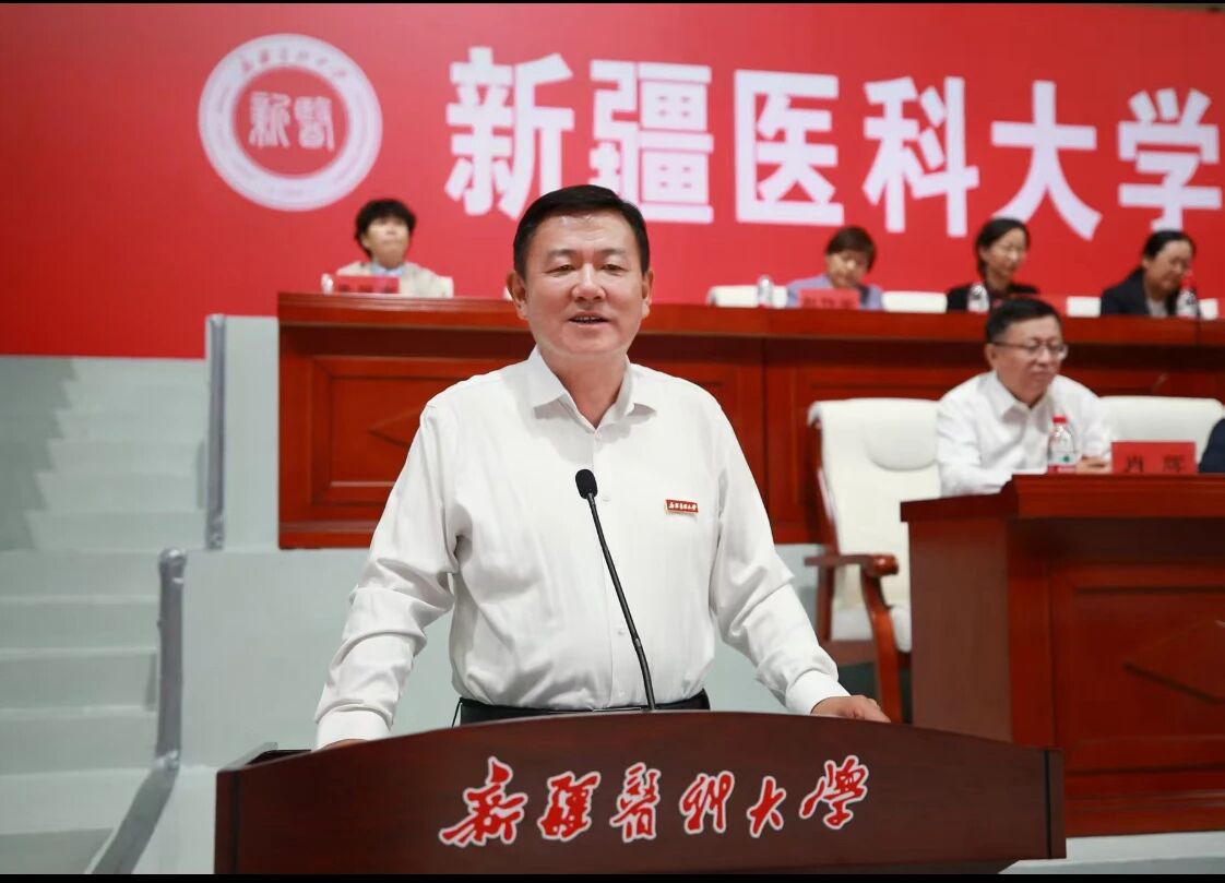 校党委书记柴林教授为2025级全体新生讲授了一堂深刻厚重又充满力量的“开学第一课”。他首先结合中国人民抗日战争暨世界反法西斯战争胜利80周年的伟大历史节点,回顾了中华民族从苦难走向辉煌的光辉历程,强调正是在中国共产党的坚强领导下,中华民族万众一心、奋发图强,才创造出今日国强民富的盛世图景,实现了方志敏烈士在《可爱的中国》中所憧憬的美好愿景,生动诠释了“四个自信”的深刻内涵。同时为同学们讲述了学校近70年来走过的光辉历程,从建校元老艰苦创业、奠定新疆现代医学教育基础,到一代代新医人勇攀高峰、创造多个区域乃至全国“第一”的医学成就,涌现出了如汪师贞、何秉贤、汪无级、阿吉艾克拜尔·艾萨、马依彤、曹力、温浩、高晓黎、李新霞、木合布力·阿布力孜、李琳琳、王国荃、姚秉礼、黎立等一大批扎根边疆、服务人民的医学大家和科研团队。新医不仅是一所扎根边疆、服务人民的光荣的大学,也是一片追求卓越、敢于争先的创新高地,更是一个各族师生团结奋进、和睦相处的温暖家园,来自全国各地乃至“一带一路”沿线国家的师生在此共筑医学梦想,用仁心仁术书写了众多促进民族团结、护佑生命健康的感人故事。