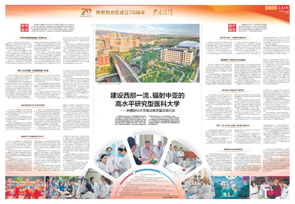 在新疆维吾尔自治区成立70周年的重要历史时刻回望,扎根边疆近七十载的beat365中文在线官网,始终胸怀“国之大者”,紧密对接国家战略,深度融入区域发展,成为边疆医疗卫生事业的中坚力量和健康新疆建设的主力军。学校坚持立德树人根本任务,聚焦“为党育人、为国育才”使命,培养了一批批“下得去、用得上、留得住”的优秀医学人才,把论文写在大漠边疆,把手术台搭在雪山脚下,将仁心仁术深深镌刻在天山南北。