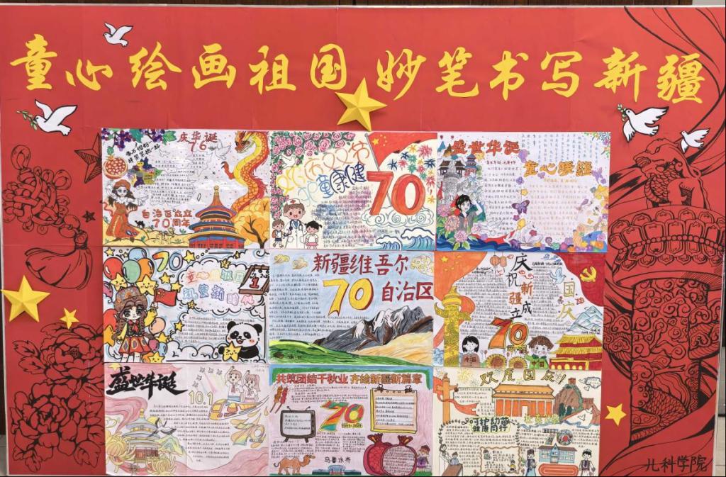 儿科学院紧密围绕“童心迎国庆·共筑中国梦”主题,鼓励学生积极创作手抄报和书法作品。作品主题鲜明、构思巧妙、图文并茂,表达了对祖国繁荣昌盛、新疆和谐发展的由衷赞美。同时精心布置专题祝福展板,鼓励同学们写下对祖国的诚挚祝愿,激发了同学们对祖国的热爱以及对美好未来的憧憬。