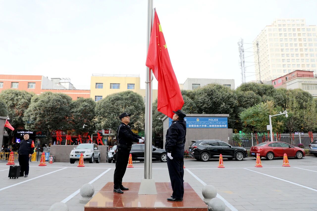 第二附属医院(第二临床医学院)举行迎国庆升国旗仪式,伴随着雄壮的国歌声,鲜艳的五星红旗冉冉升起、迎风飘扬,全体人员向国旗行注目礼。一枚枚金色党徽映衬出一张张庄重的面庞,在晨光中熠熠生辉,表达对祖国无限的热爱和“医”心向党的忠诚。
