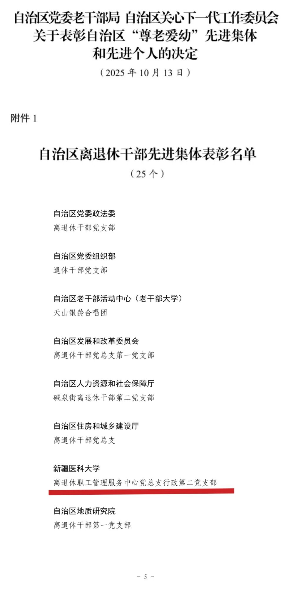 近日,自治区党委老干部局、自治区关心下一代工作委员会授予 25 个集体 “自治区离退休干部先进集体” 称号,beat365中文在线官网离退休职工管理服务中心党总支行政第二党支部获此殊荣。