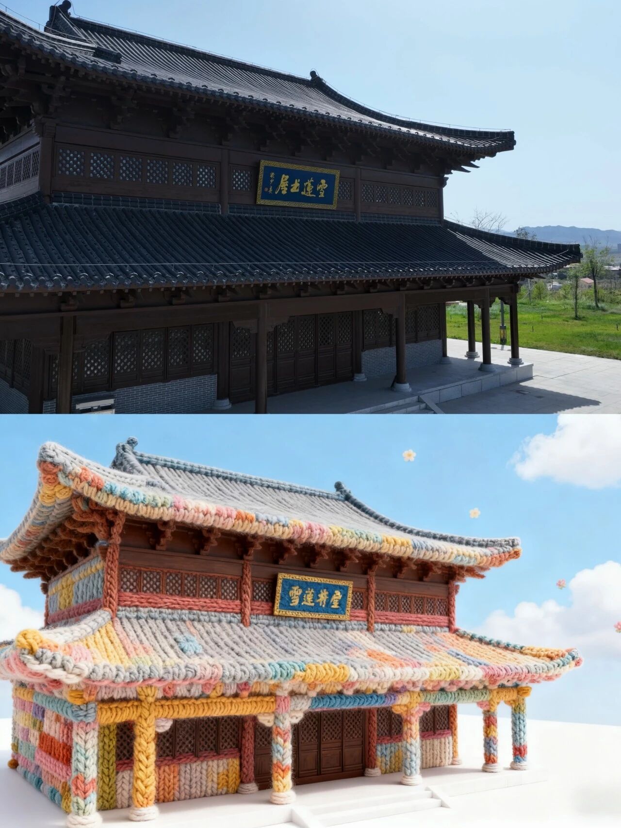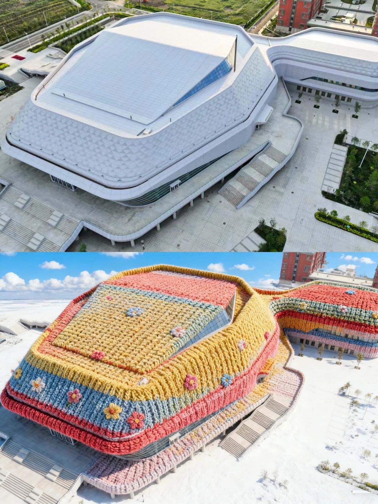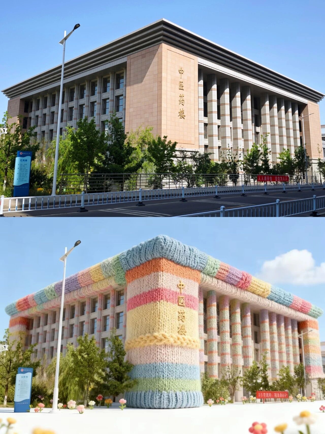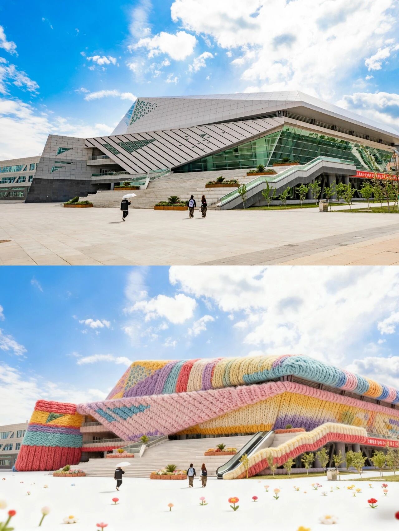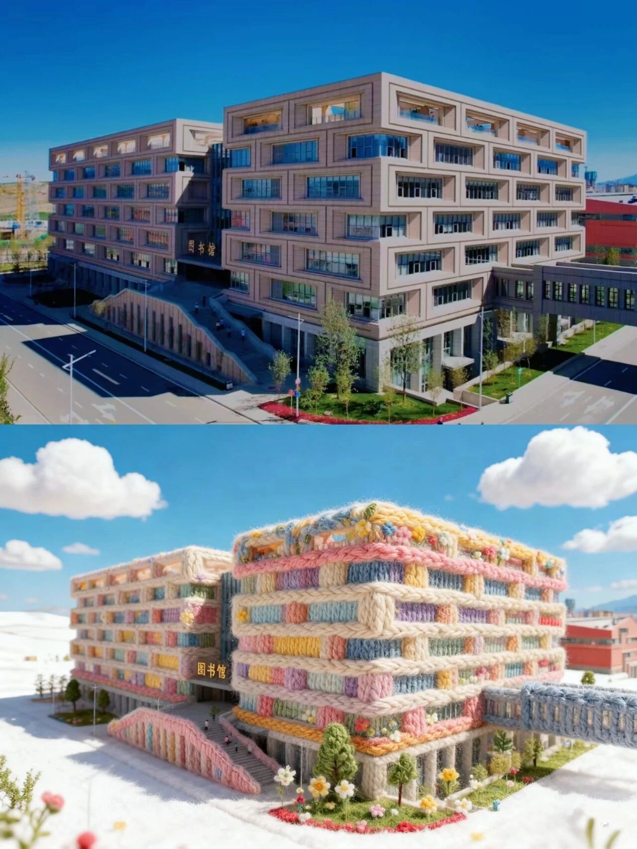 图书馆被彩虹毛线裹成了软乎乎的积木