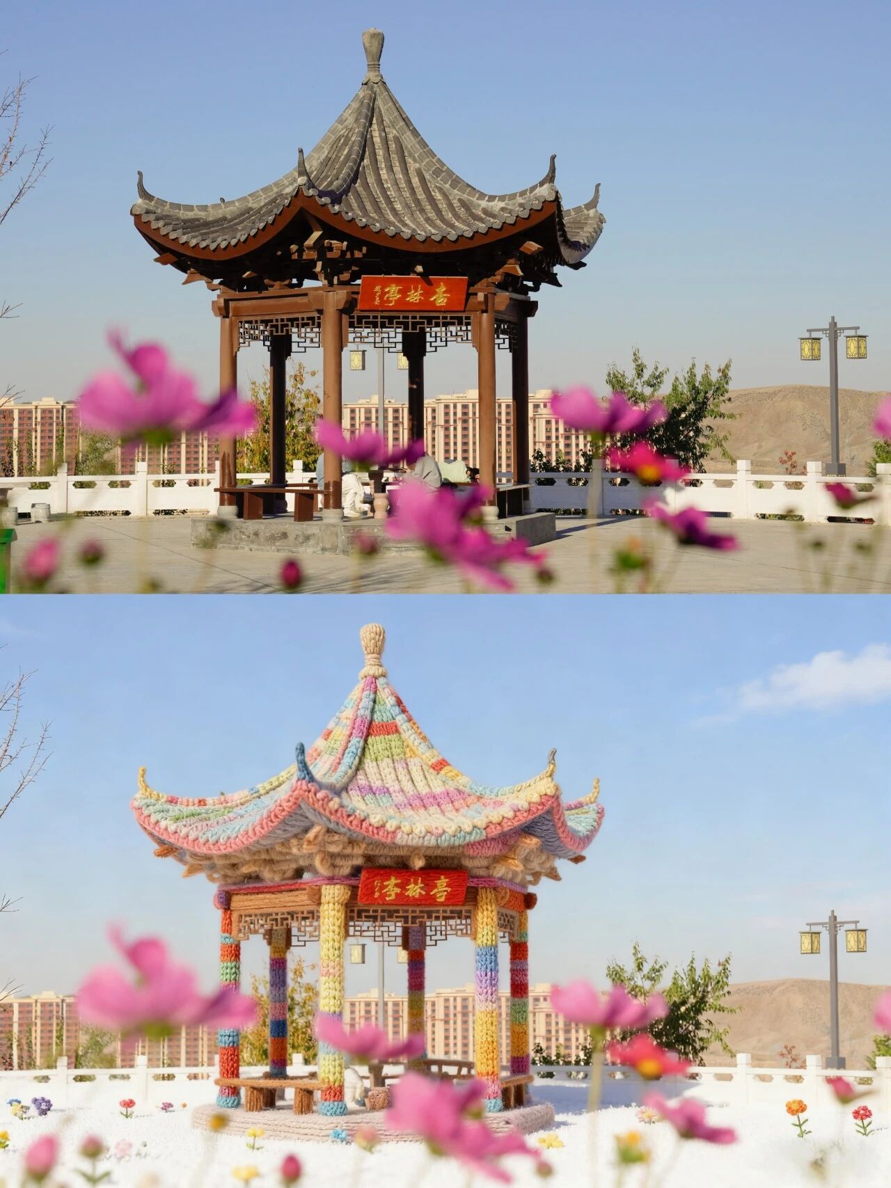 杏林亭的飞檐翘角被彩线缠成了糖霜模样