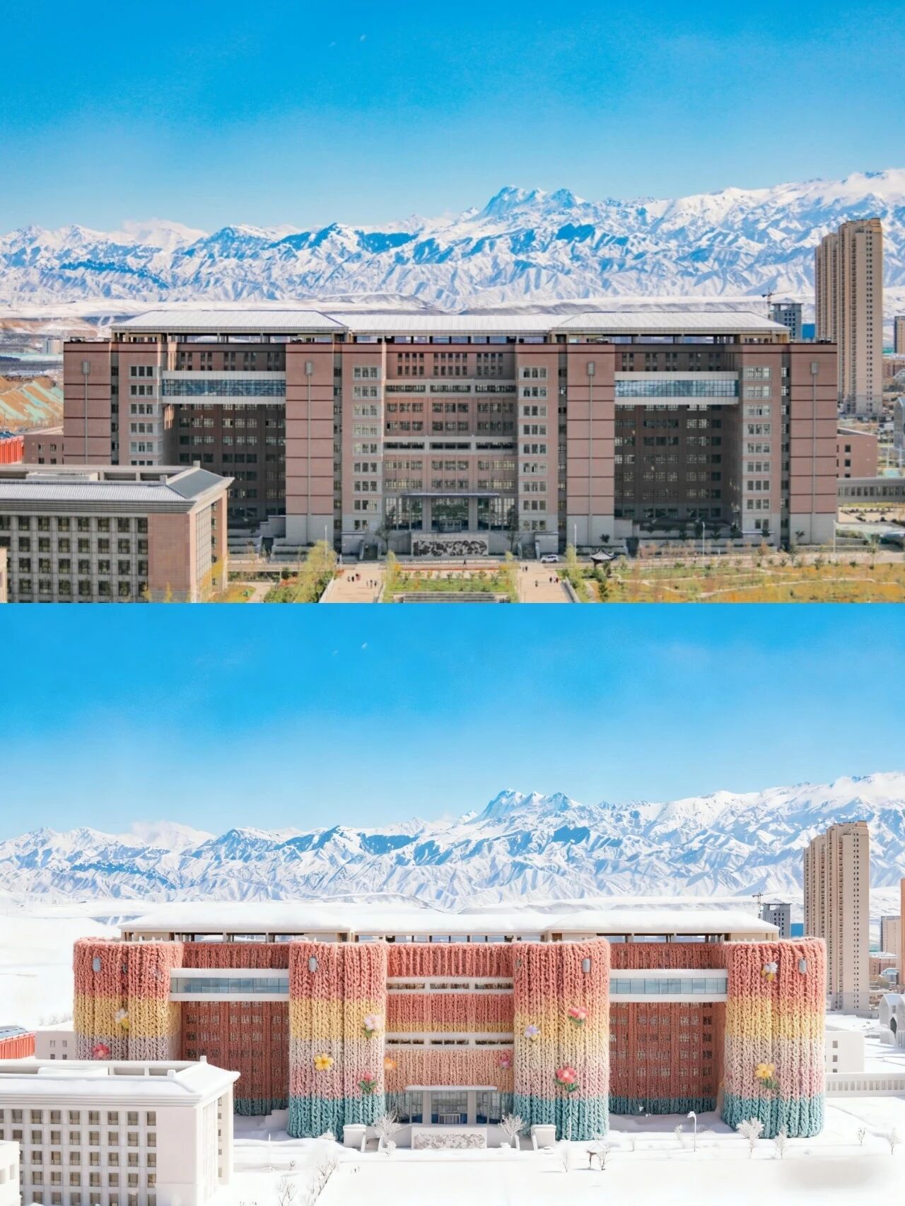 教学楼在雪山下穿着毛衣温柔伫立
