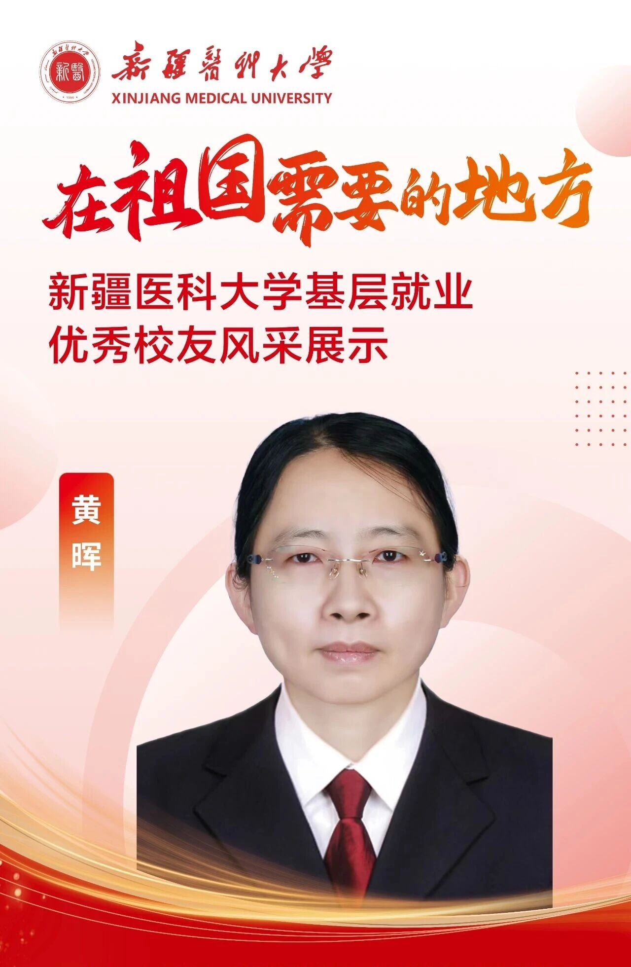 黄晖,中共党员,2003年毕业于公共卫生学院预防医学专业,现为乌恰县人民医院公共卫生科主治医师。毕业时。她作为新疆首批西部计划志愿者,奔赴祖国最西部乌恰县开展志愿服务,扎根当地22年,将青春奉献给边疆医疗事业,荣获中国志愿服务金奖。