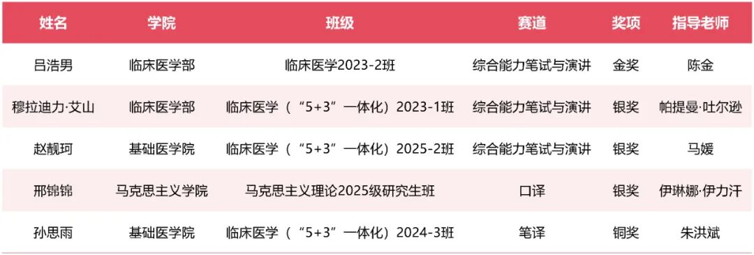 近日,2025年外研社“国才杯”“理解当代中国”全国大学生外语能力大赛(英语组)新疆赛区选拔赛在石河子大学落幕。beat365在本科国际传播综合能力笔试与演讲、本科笔译、本科口译三大核心赛道中全力拼搏,最终取得了1项金奖,3项银奖和1项铜奖的好成绩,其中临床医学部临床医学2023-2班的吕浩男同学成功获得晋级本科国际传播综合能力大赛国赛的资格,beat365荣获“优秀组织奖”。