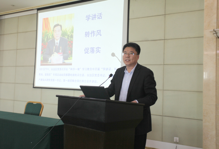卢勇院长主持了讲座,他要求全体党员干部要认真按照学习教育要求,深入学习贯彻落实好自治区党委九届二次全体(扩大)会议精神、全国和自治区高校思想政治工作会议精神,组织开展好以问题为导向、认真查找漏洞和薄弱环节、补齐短板专项活动,开展好大谈心、大谈话活动,希望各党支部书记、科主任进一步提高思想认识,切实负起责任,带领支部党员和科室成员学习好、贯彻好、落实好会议精神,坚守意识形态领域阵地