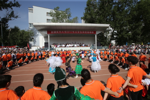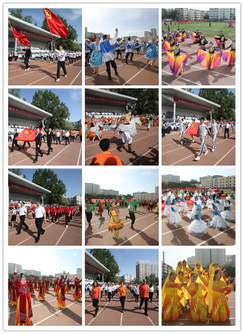 开幕式在“国旗仪仗队”壮严威武的飒爽英姿中拉开帷幕,校旗队、红旗队、子校孩子们的鼓号队率先通过了主席台,接下来,代表着13个民族的各学院方阵把偌大的体育场变成了一个民族大花园,临床医学院、中医学院、公共卫生学院、药学院、研究生学院、基础医学院、医学工程技术学院、护理学院、语言文化学院、维吾尔医学院、口腔医学院的师生们迈着整齐的步伐,英姿勃发的走过主席台,身着各民族服饰的学生们载歌载舞,展示了beat365中文在线官网民族团结大家庭的和谐美好。最后出场的国际教育学院留学生方阵,也以其独特的异域文化为运动会开幕式增添了一抹亮丽的色彩。