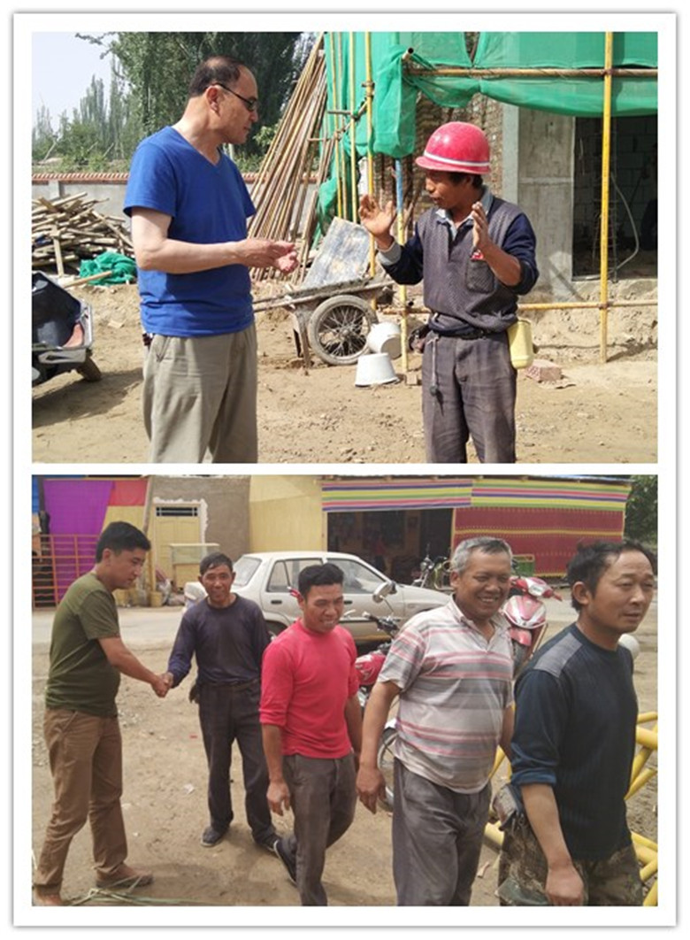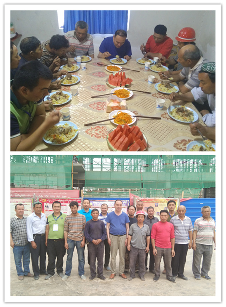 中午,工作队还邀请工人们来到村委会,与工作队员、村干部们一起共进午餐。亚克夫·吐尔地说:“今天是个好日子,大家齐聚一堂,就像石榴籽一样紧紧团结在一起。各位工人同志很辛苦,我们工作队员要学习你们‘不怕苦、不怕累’的精神,做好本职工作。大家来自全国各地,有缘相聚在这里,我们就是一家人。有句老话说得好“兄弟齐心,其利断金”,让我们携手共进,一起建设美丽新疆。”工人们说,感谢工作队一直以来的帮助,一定确保在工期内保质保量地完成村幼儿园建设,用实际行动为新疆建设添砖加瓦。