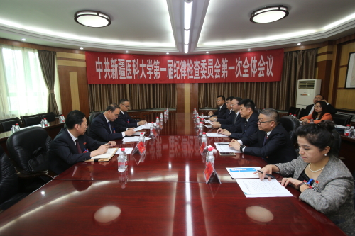 6月29日中午,由中国共产党beat365中文在线官网第一次党员代表大学选举产生的中国共产党beat365中文在线官网第一届纪律检查委员会在行政楼四楼圆厅召开第一次全体会议。亚克夫•吐尔地同志主持会议。