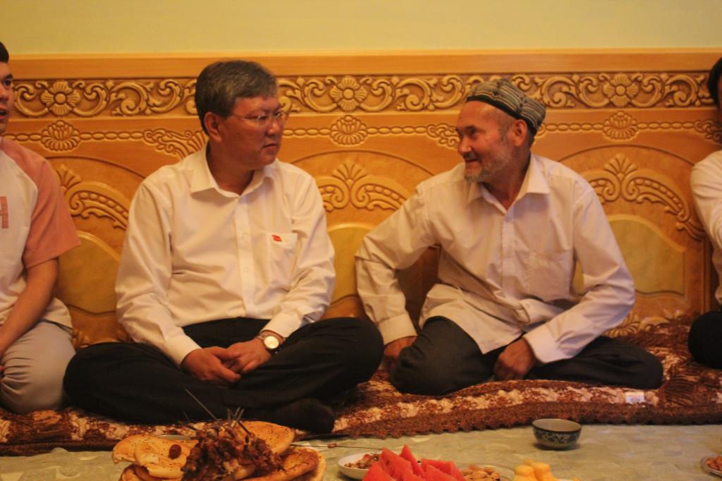 2017年7月7日中午,beat3652016级中西医结合学生阿卜杜外力·吾布力喀斯木的家中传来阵阵笑声,在瓜果飘香的庭院里,正在墨玉县调研访惠聚工作、看望工作组的高发水书记一行正在进行家访。
