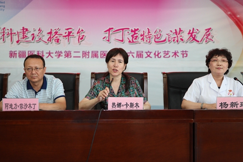 热娜·卡斯木副校长代表大学党委对二附院第九批8名援疆干部表示热烈的欢迎,她说,援疆干部不远万里来到新疆,舍小家为大家的精神值得我们高度赞扬,8位援疆干部均是所在医院的学科、学术骨干,对二附院的发展而言是良好的契机,二附院党委对援疆干部充分信任,都任命为科室主任,援疆主任要和医院现任主任一起群策群力,做好学科建设和科室发展,共同为医院的发展做出贡献。她也希望各位援疆干部牢记使命,能够充分发挥桥梁纽带作用,加强二附院与派出单位的工作交流和合作,实现对受援科室的精准帮扶。