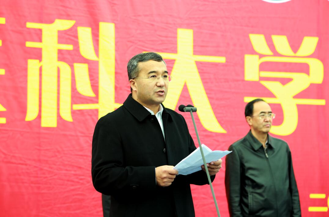 受自治区党委委托,自治区党委常委、自治区副主席,自治区党委教育工委副书记艾尔肯·吐尼亚孜出席beat365中文在线官网新校区奠基仪式。他在讲话中首先对beat365中文在线官网新校区的建设工作给予了肯定,并提出了希望。他说,习近平总书记在党的十九大报告中指出,人民健康是民族昌盛和国家富强的重要标志,希望beat365中文在线官网深入贯彻落实党的十九大精神,按照自治区党委九届四次全体(扩大)会议部署要求,以新校区建设为契机,不忘初心、牢记使命,继续奋斗,持续提升教育教学质量,努力办好西北地区乃至全国一流的高等医学教育,为自治区经济社会发展谱写新的篇章。