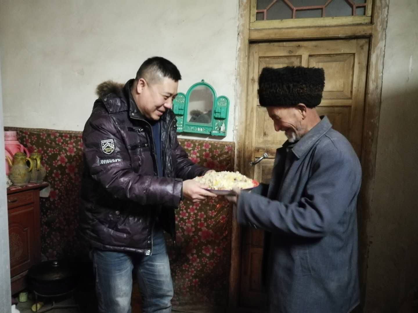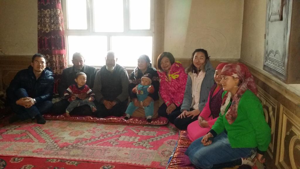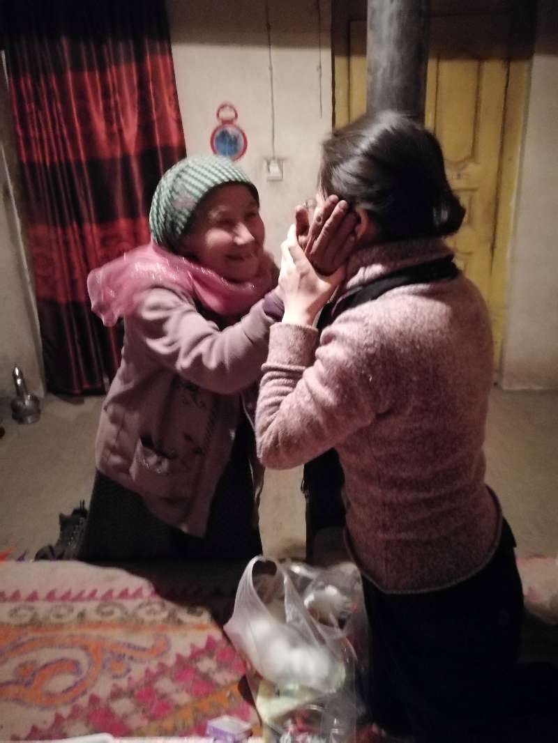 在库提热木村,来自新医大一附院组织干部科的王郁、介入放射科的陈实、手术室的汤婷、透析室的夏热甫古丽和学生科房富利组成了一个5人结亲小组。在结亲干部王郁的亲戚—71岁的亲戚吐热汉•艾力大妈家中时,丰盛的食物让大家眼角湿润。听说结亲干部们要来,吐热汉大妈早早打了馕用布包起来,为结亲干部们准备了自己舍不得吃的香蕉、橘子和干果,将家中最暖和的房间收拾干净,准备好了炉子和几床厚实的被子。