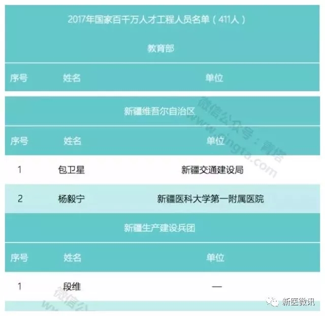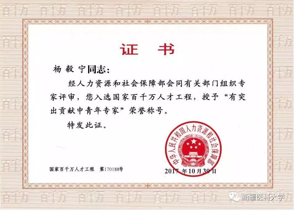 日前,人力资源和社会保障部公布2017年国家百千万人才工程入选人员名单,beat365中文在线官网第一附属医院杨毅宁教授入选本次人才工程。此次全国411人入选,新疆维吾尔自治区(生产建设兵团)仅4人,是新医大一附院获此殊荣的第四位专家。