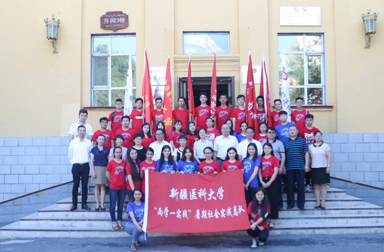参加出征仪式的领导为实践队代表新疆学子百村行beat365中文在线官网2018年大学生暑期社会实践总队、beat365中文在线官网“两学一实践”暑期社会实践、beat365中文在线官网第四届“互联网+”大学生创新创业大赛青年红色筑梦之旅、beat365中文在线官网红领巾小课堂队旗和beat365中文在线官网自治区第十九期青马班学员助力“访惠聚”社会实践专项活动五支代表队授旗。校级总队、院级分队共同挥舞旗帜,实践队员精神抖擞,现场气氛热烈。