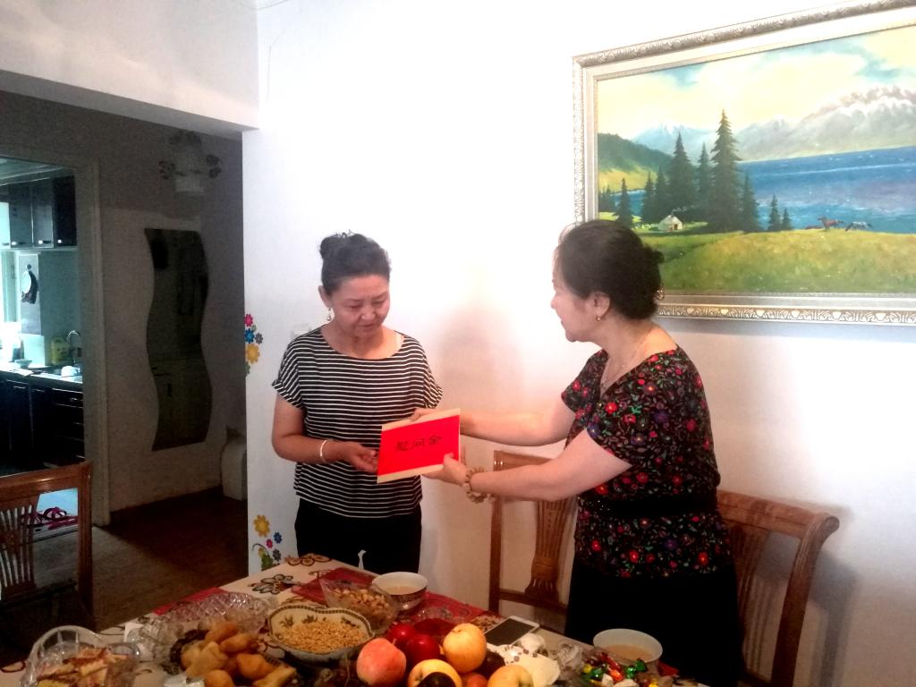 “古尔邦节快乐!”李勇生常委一行来到基础医学院阿仙·哈斯木家中,向她和她的家人祝贺节日,关切地询问工作、生活等情况,送上了鲜花和慰问金。阿仙姑·哈斯木在工作上是一把好手,在家中也是一位好妻子、好母亲,家中收拾得干净整洁,一儿一女乖巧可爱。在她家中看望慰问时,李勇生说:“今天是古尔邦节,我们代表党委来看看你和你的家人,祝你们节日快乐、阖家幸福。”