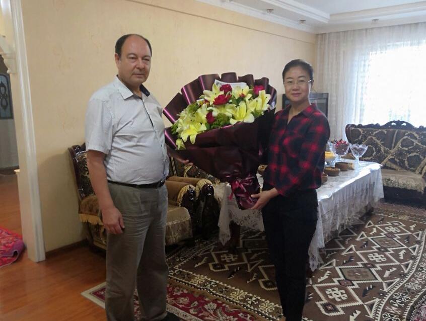 凯赛尔校长一行首先来到附属中医医院周光教授的家中,为他献上鲜花和节日祝福。