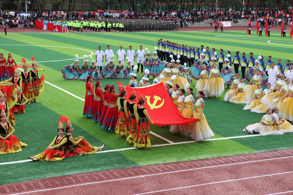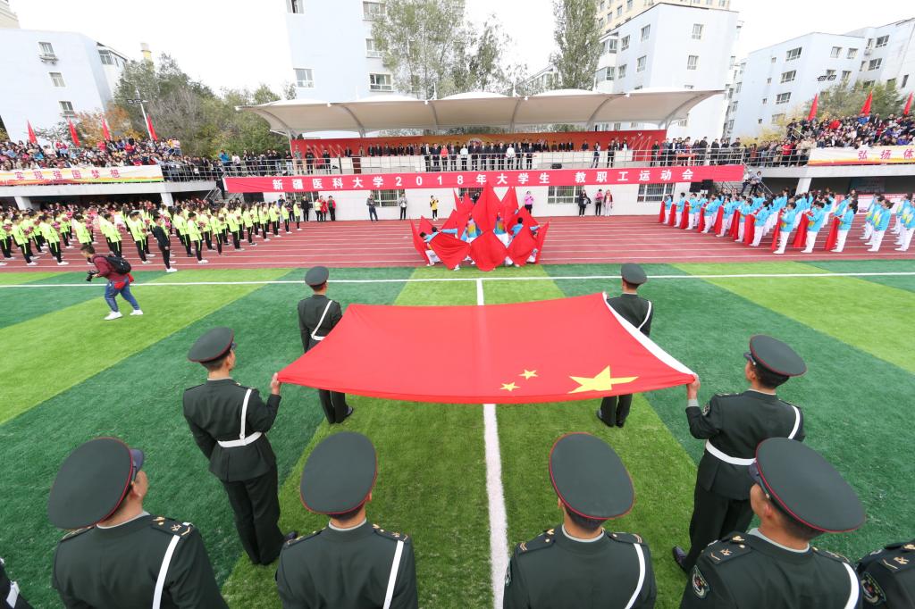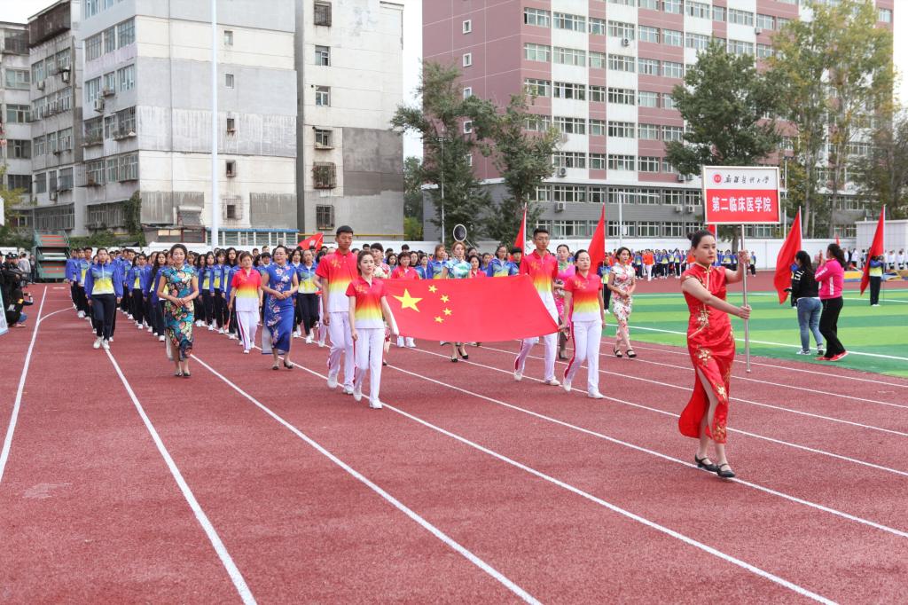 9点30分,在激昂的运动员进行曲中,运动会拉开了序幕。雄赳赳气昂昂,威武庄严的国旗仪仗队率先通过主席台,面面国旗体现着全体新医人,人心向党,坚持社会主义办学方向的信心和斗志。
